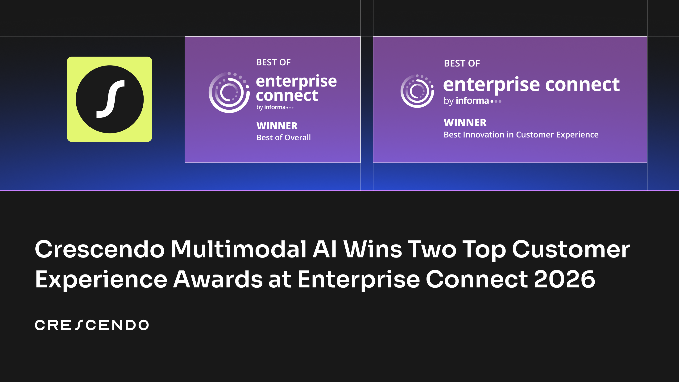 LAS VEGAS — Enterprise Connect - March 11, 2026 —Crescendo, the first AI-native contact center, today announced that Crescendo Multimodal AI won Best Innovation for Customer Experience and Overall Best of Enterprise Connect 2026, two of the conference's highest honors for breakthrough innovation in enterprise CX.