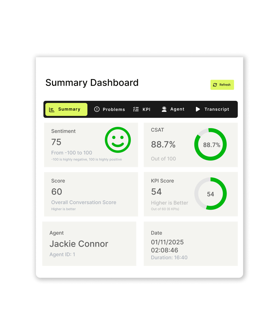 Customer sentiment is analyzed after every conversation, with a summary highlighting what went well and what didn’t. This helps agents and CX leaders gain clearer insights for continuous improvement and training.