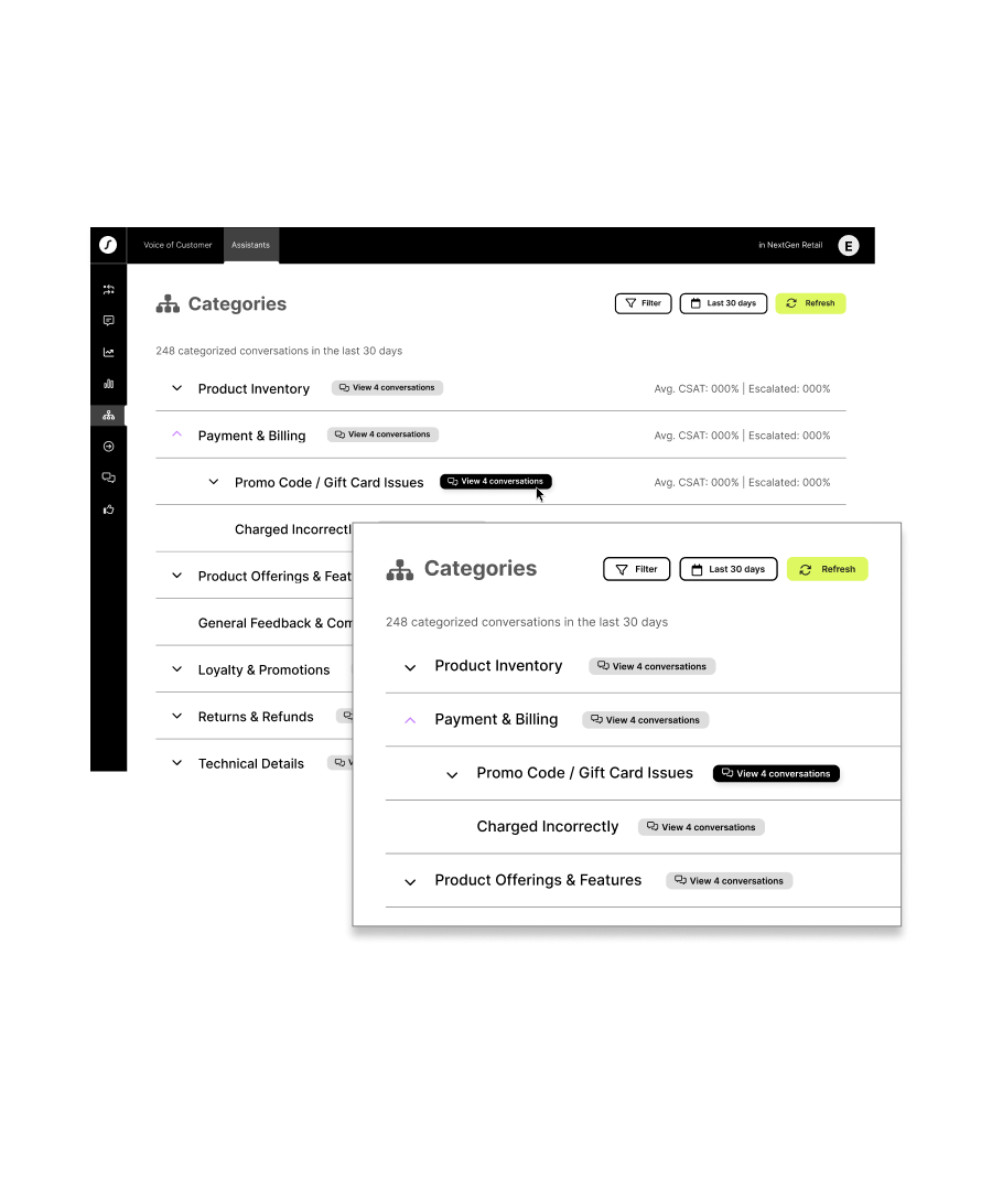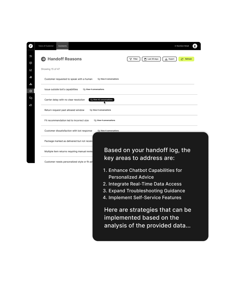 Our AI-powered Voice of Customer tools pinpoint the exact reasons behind each handoff, revealing which types of issues prompt customers to seek human support. This insight helps you better train your team and fine-tune your AI workflows to handle those scenarios more effectively in the future.
